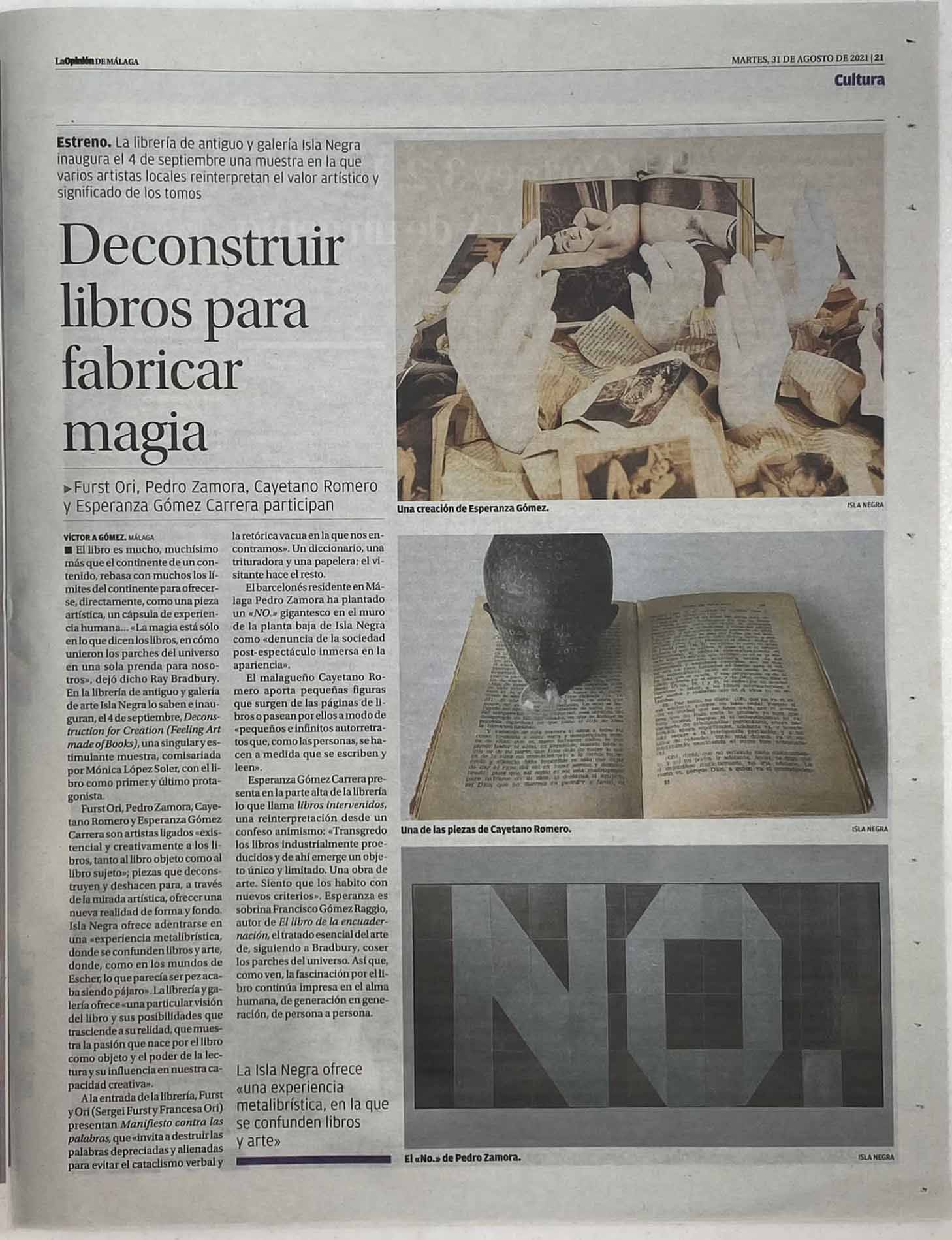 Galería Isla Negra, Málaga. 09-2021. Colectiva de artistas que trabajan la creación plástica a partir de los libros y la literatura. Esperanza Gómez Carrera, Cayetano Romero, Pedro Zamora y Ori-Furst.